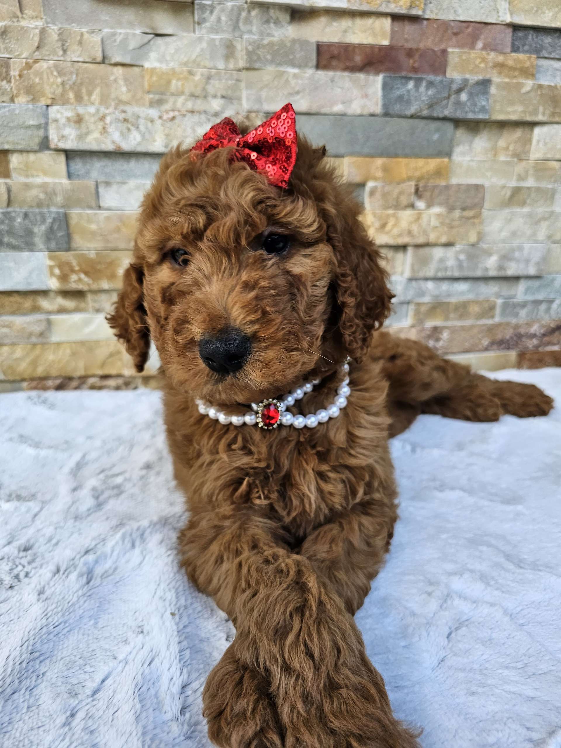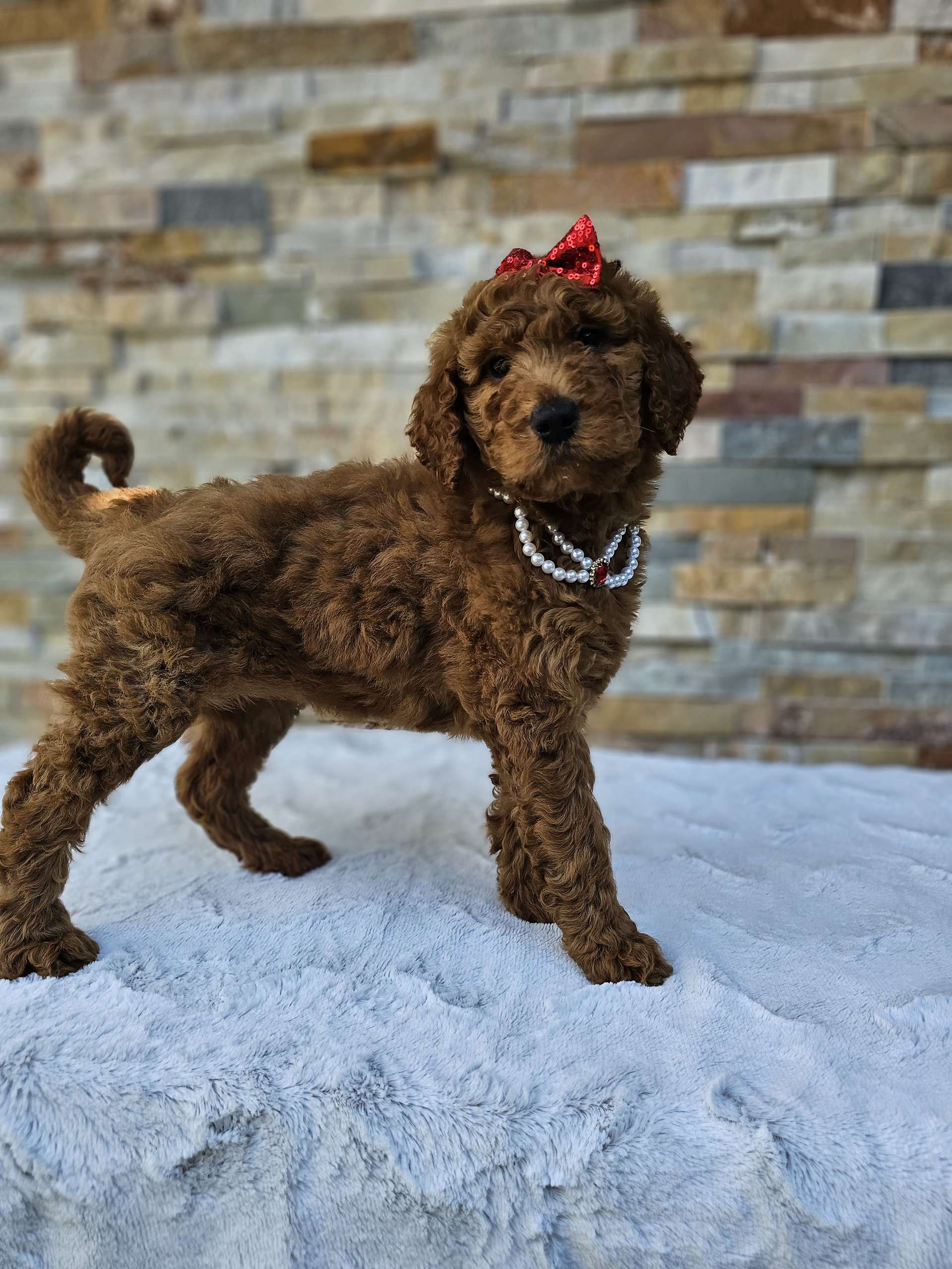 Lady Ruby Luxe is a breathtaking standard Goldendoodle female with a rich mahogany coat and a presence that turns heads instantly.