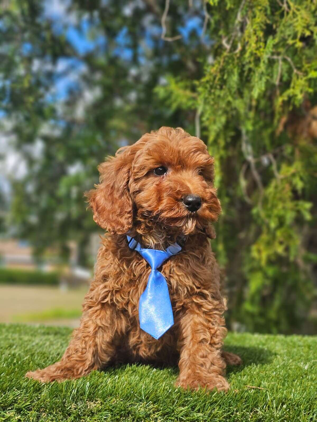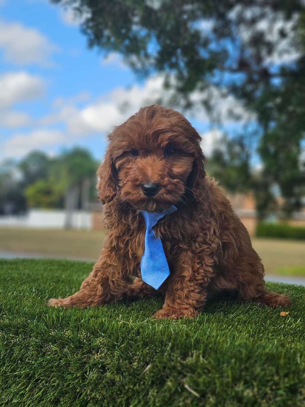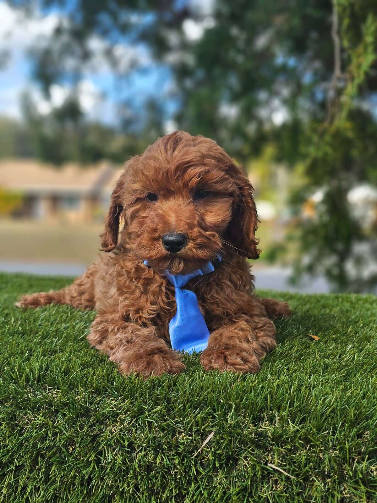 This mini Goldendoodle brings executive energy, serious side-eye, and teddy-bear curls. He may be mini, but his confidence is full size. Résumé includes: snack inspector, cuddle supervisor, and couch manager.