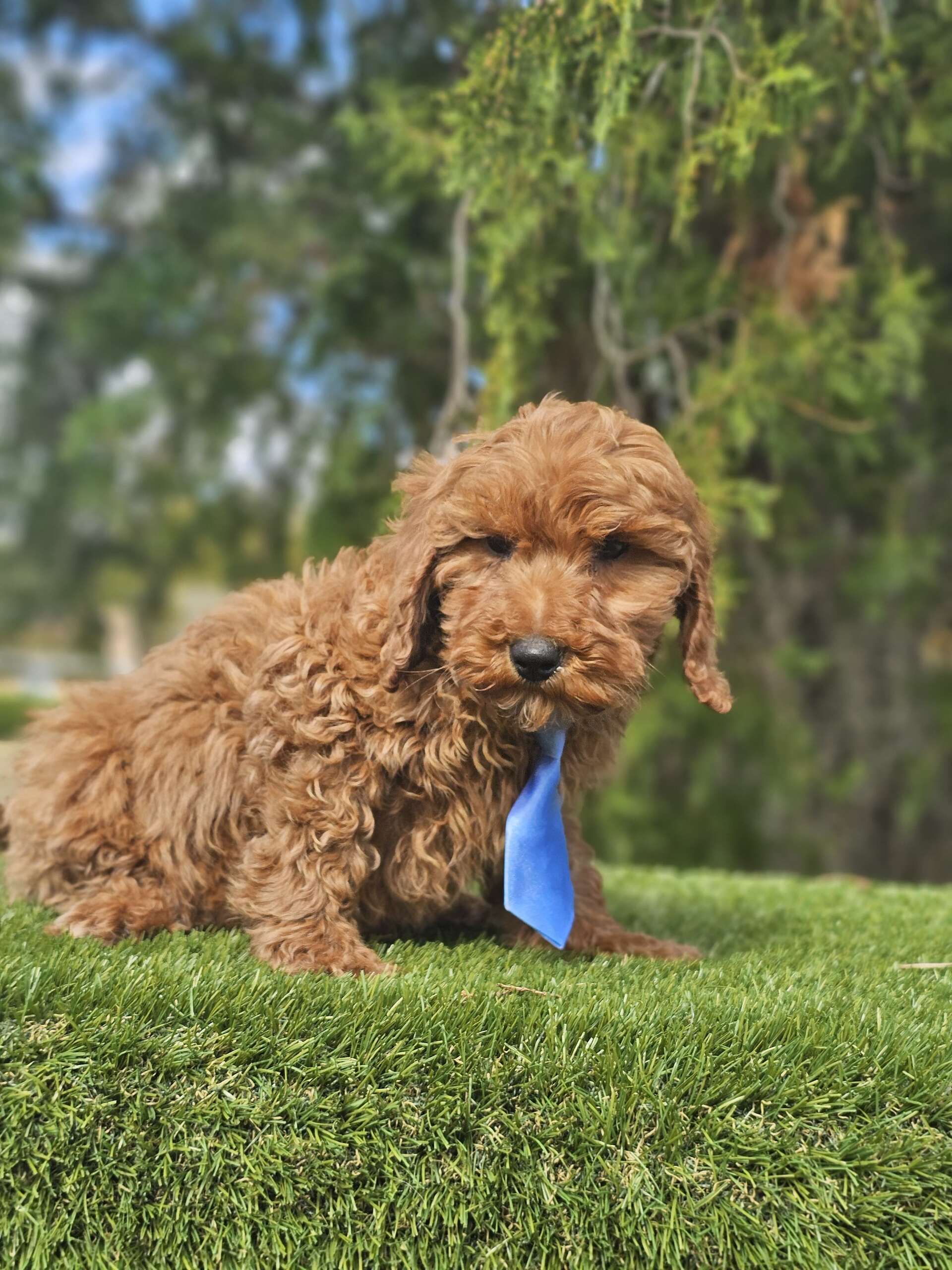 Este Goldendoodle mini viene con energía de ejecutivo, mirada seria y rulos tipo teddy. Podrá ser pequeño, pero su seguridad es tamaño completo. Su currículum incluye: inspector de snacks, supervisor de mimos y gerente del sofá.