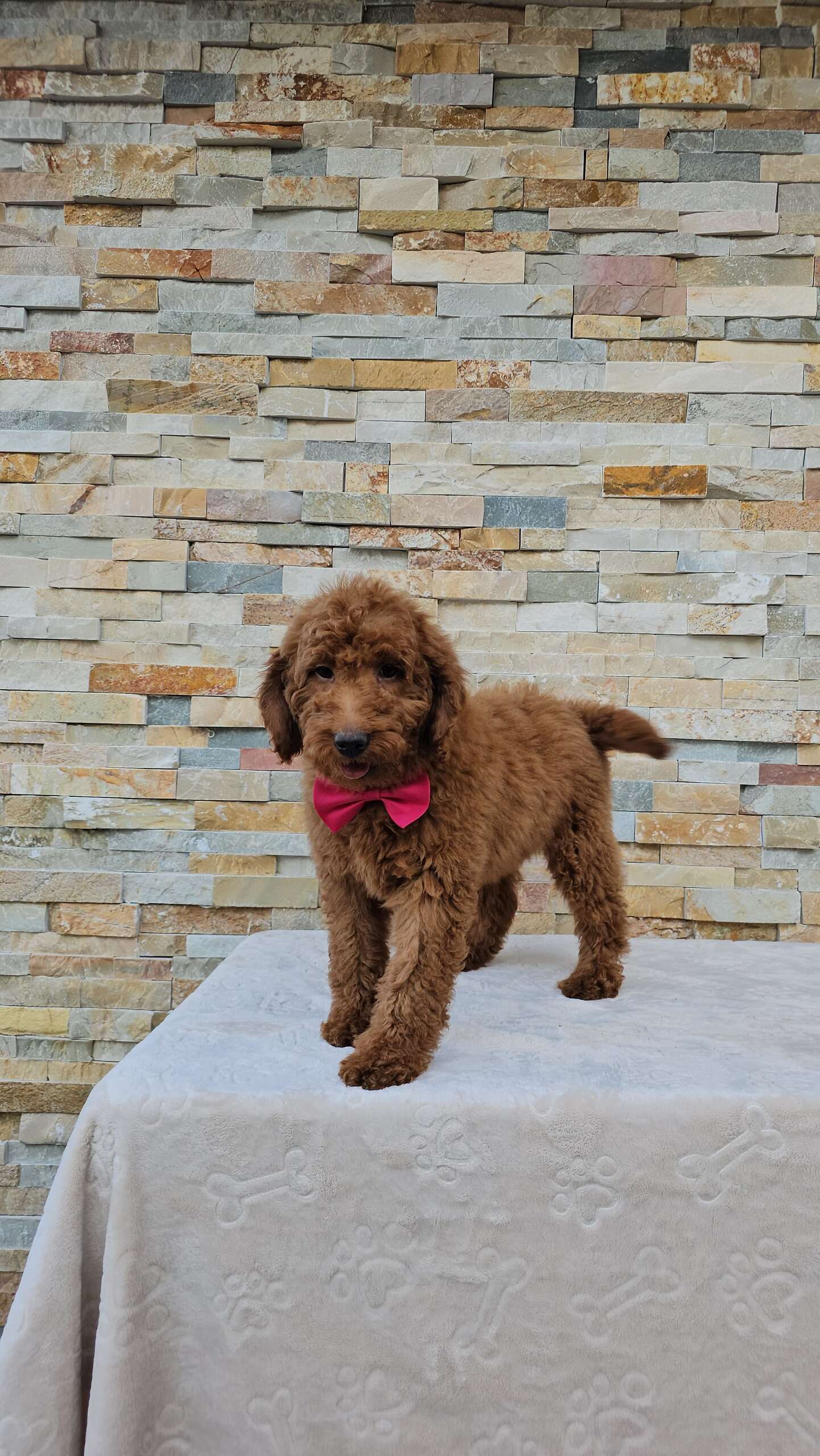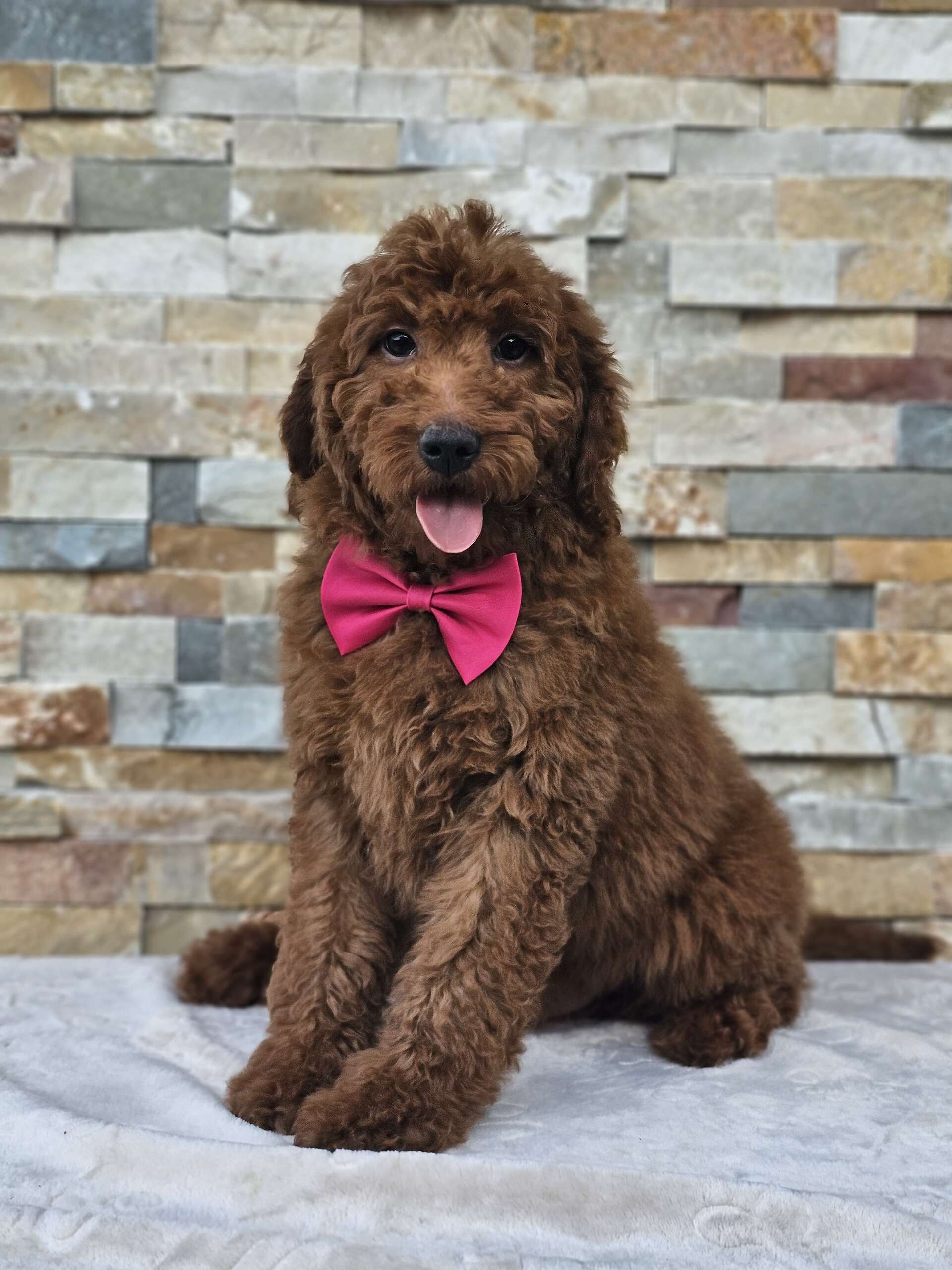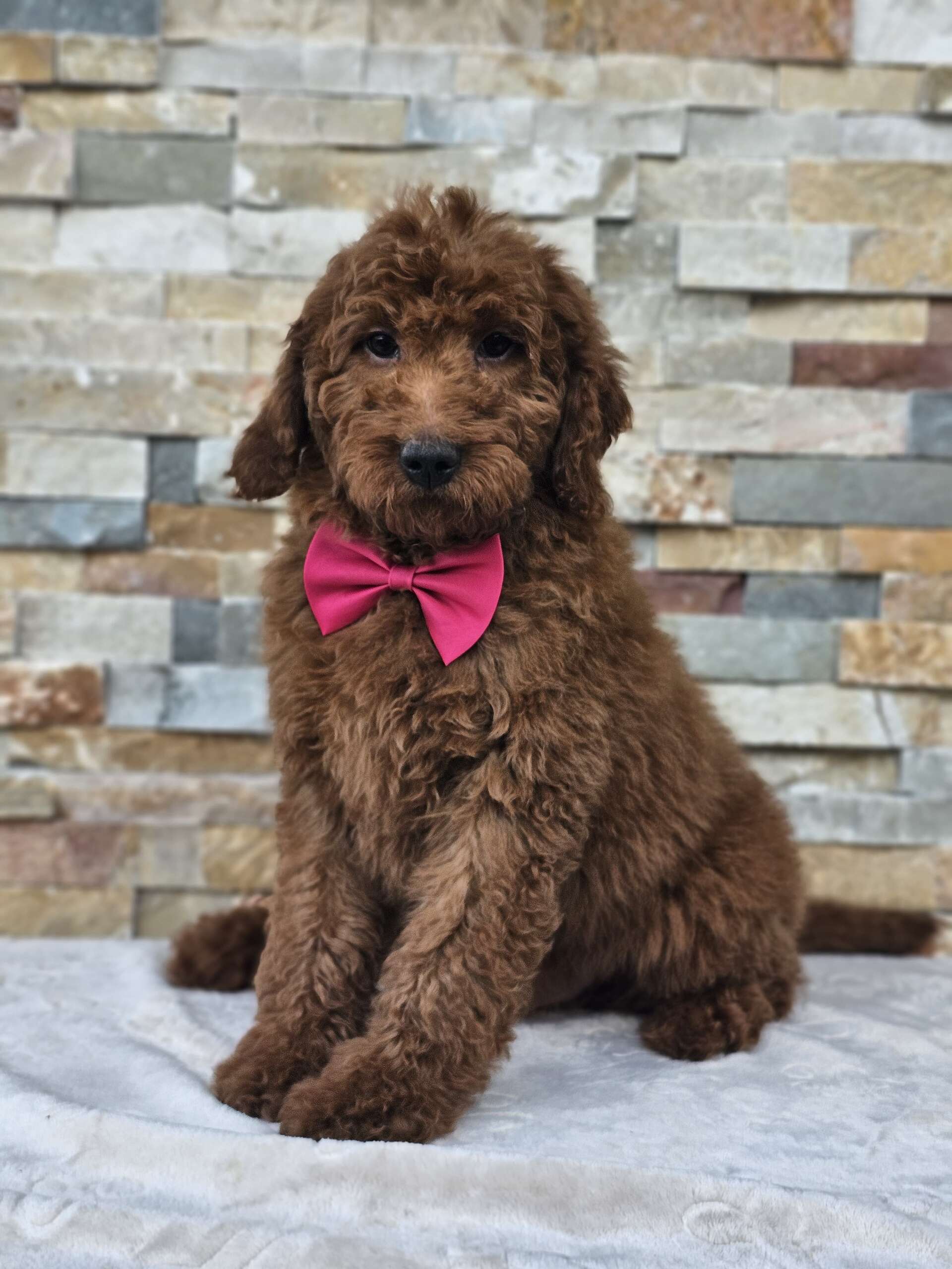 Este Goldendoodle macho tamaño mediano tiene un hermoso color caoba oscuro, presencia dominante y personalidad encantadora. Juguetón, inteligente, cariñoso y con el balance perfecto entre energía y tranquilidad. Ese lazo no es accesorio — es actitud de patrón. No bota pelo, ideal para familias, criado con amor por Goldendoodles by Aggie.