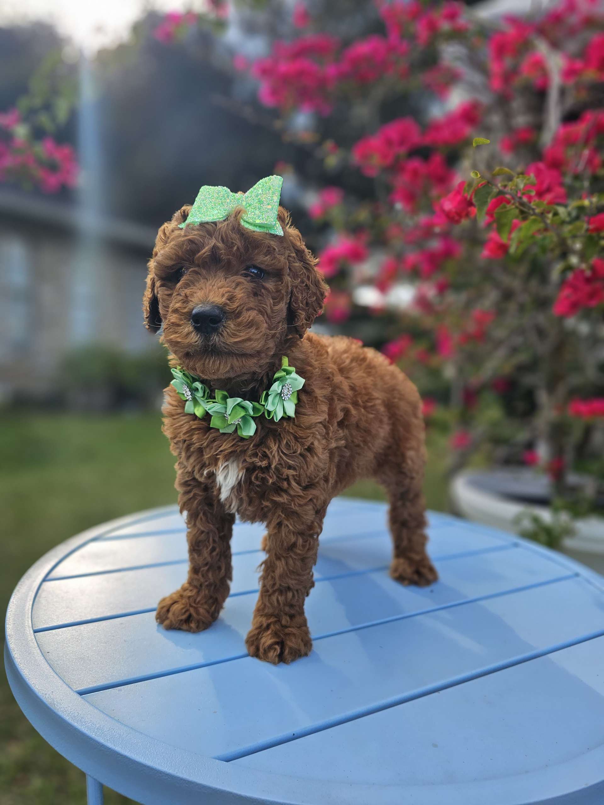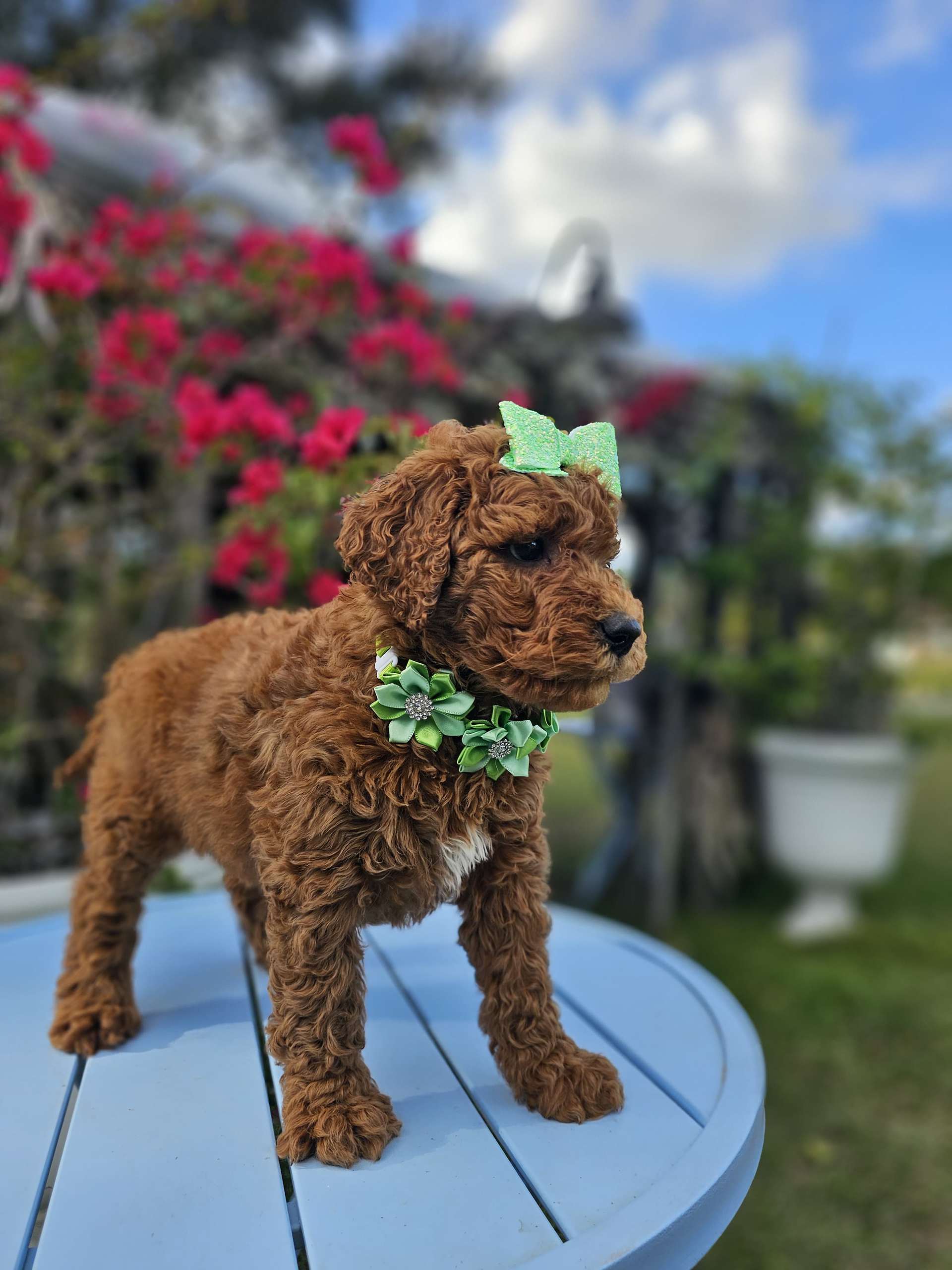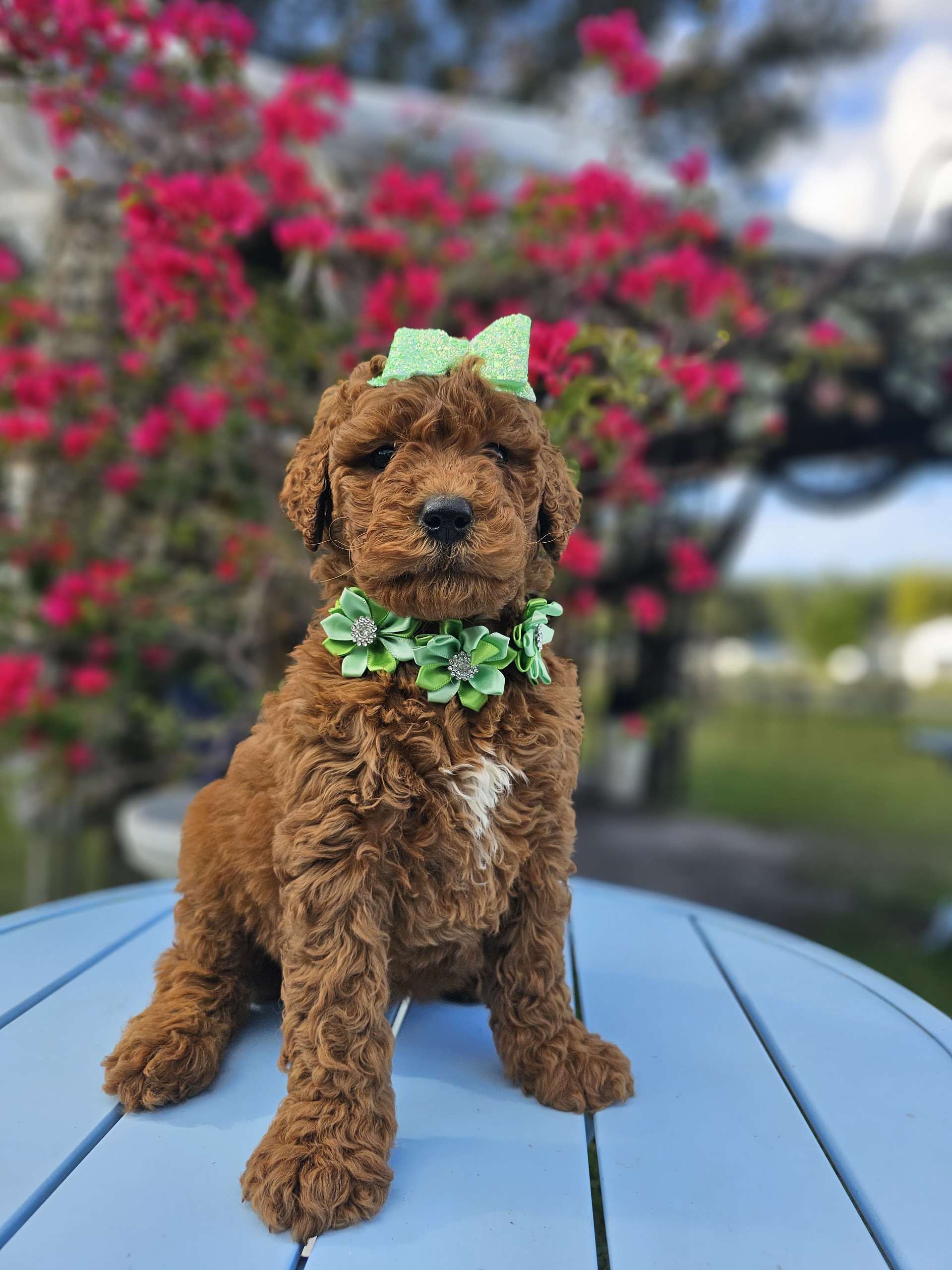Pistachia Pop is a medium Goldendoodle with zero thoughts, one brain cell, and a full-time job stealing hearts. She sits like she pays rent, stares like she knows your secrets, and hops around like life is a musical. Soft curls, squishy paws, and goofy energy on maximum—she’s not just cute… she’s a lifestyle 💅😂💚 For more info call/text us (407)655-6285 or visit us at https://goldendoodlesbyaggie.com/available-pups