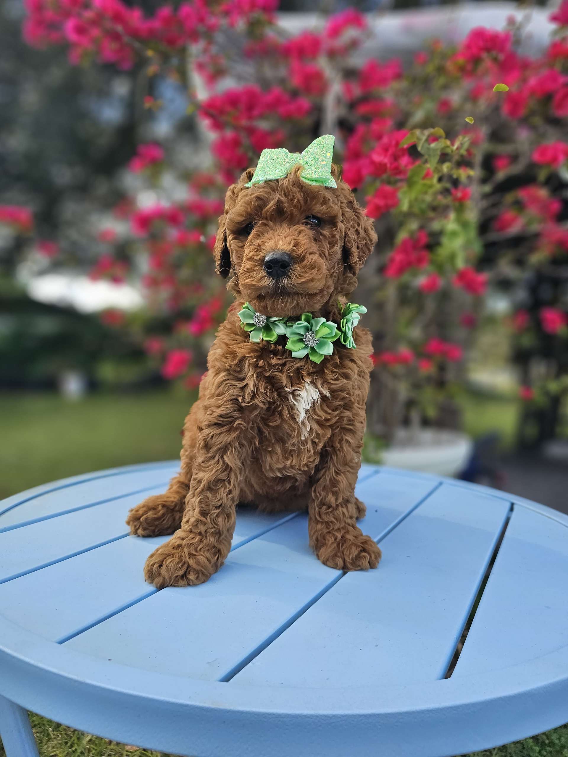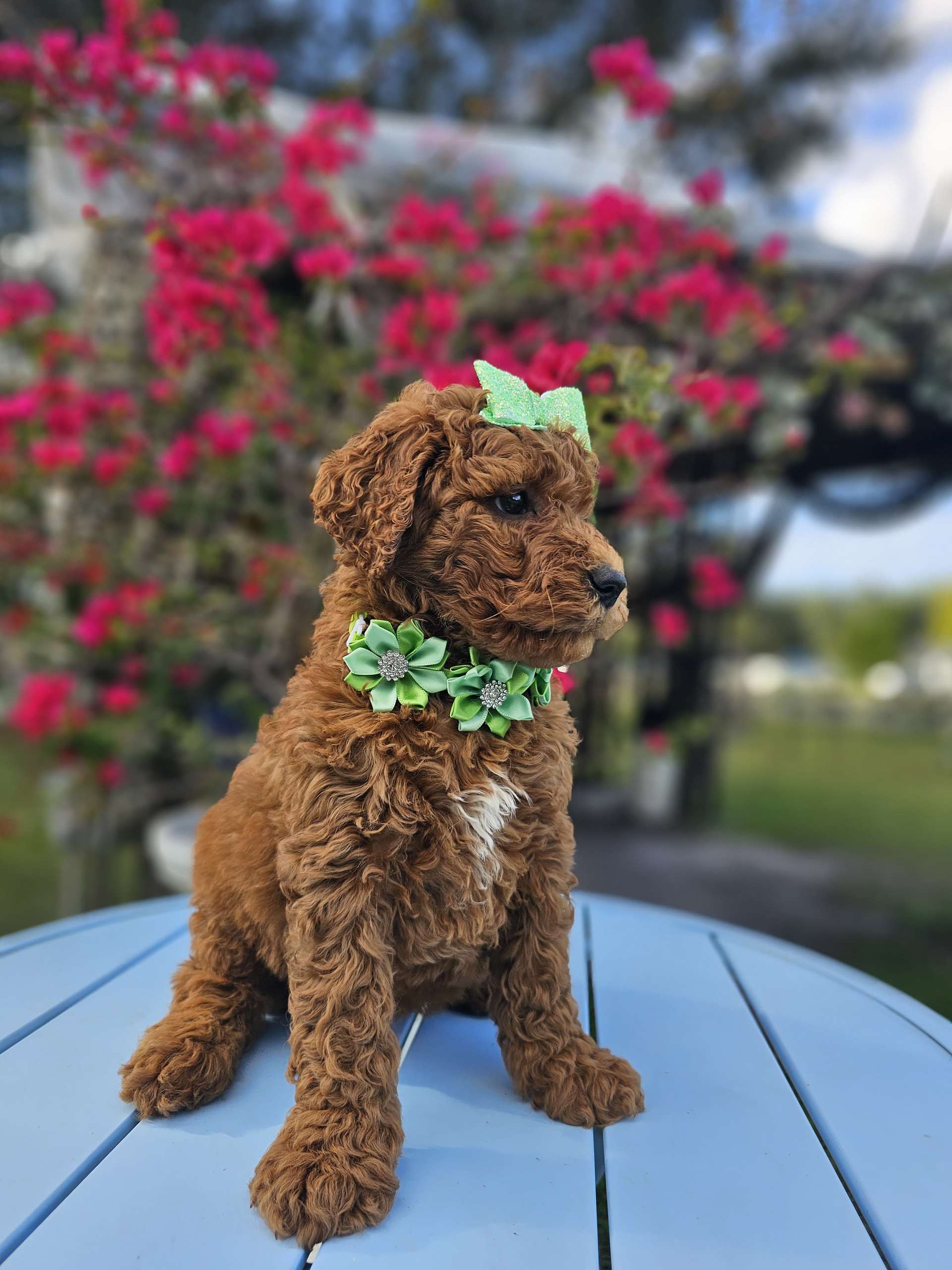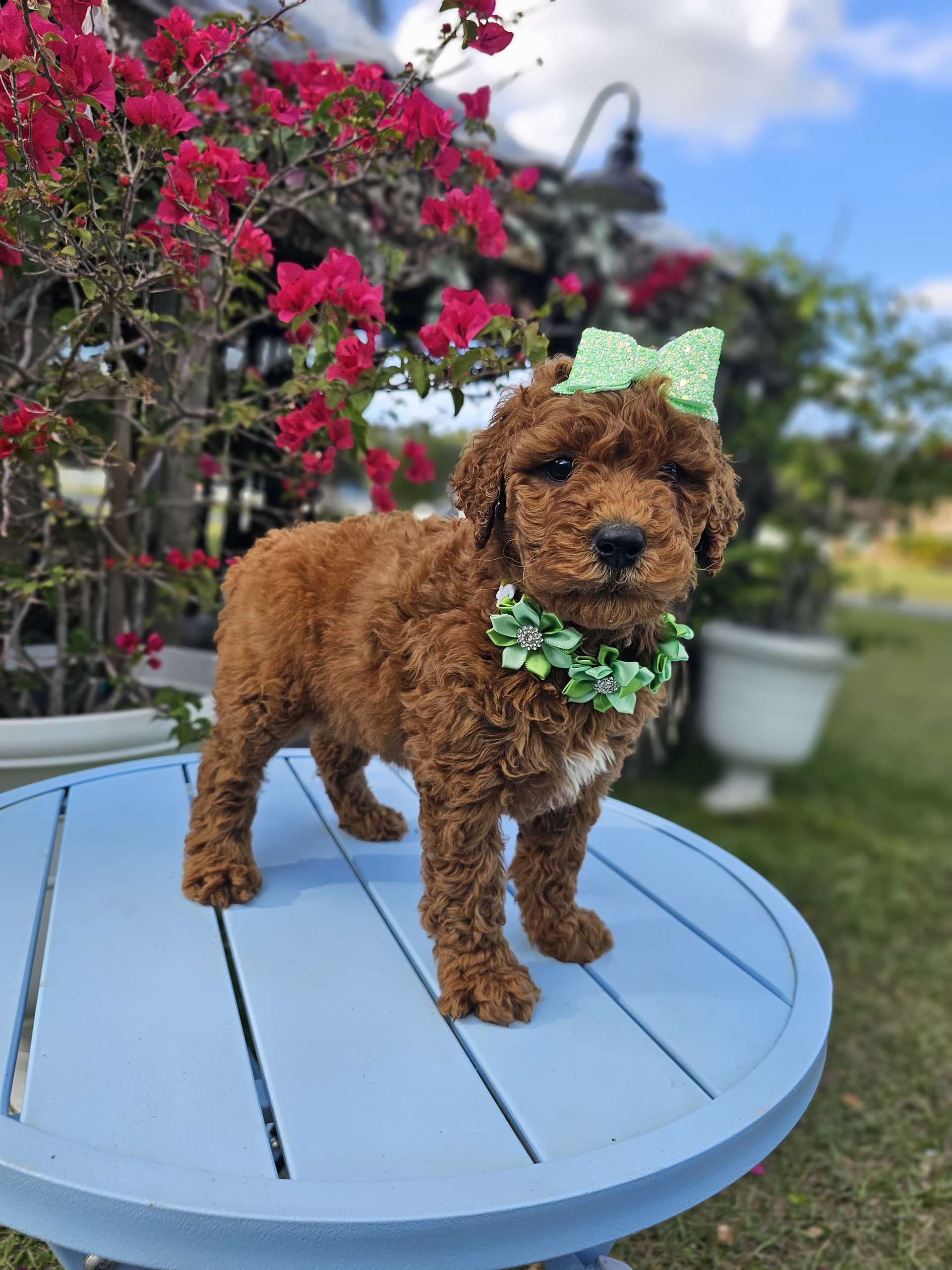 Pistachia Pop is a medium Goldendoodle with zero thoughts, one brain cell, and a full-time job stealing hearts. She sits like she pays rent, stares like she knows your secrets, and hops around like life is a musical. Soft curls, squishy paws, and goofy energy on maximum—she’s not just cute… she’s a lifestyle 💅😂💚 For more info call/text us (407)655-6285 or visit us at https://goldendoodlesbyaggie.com/available-pups