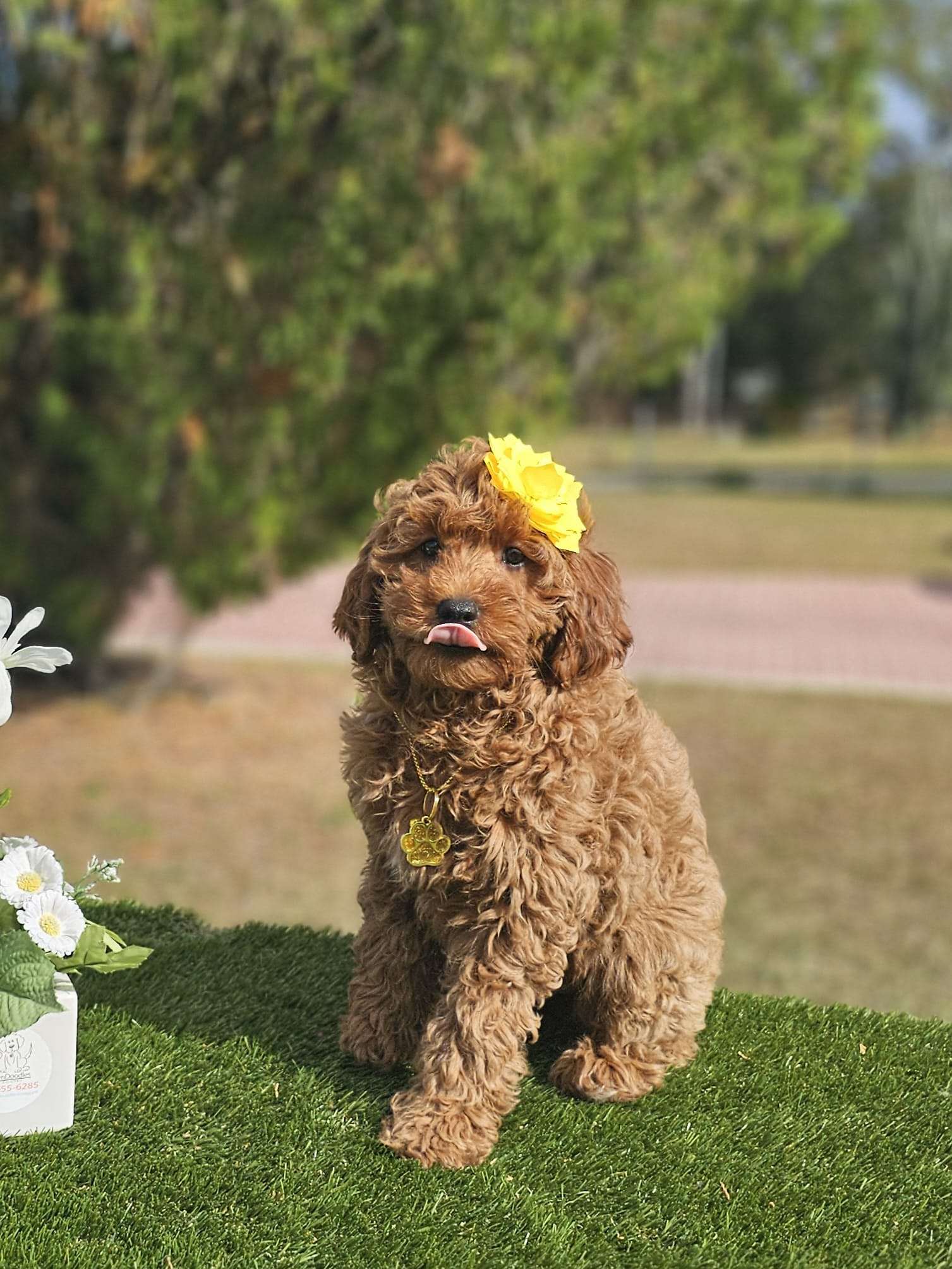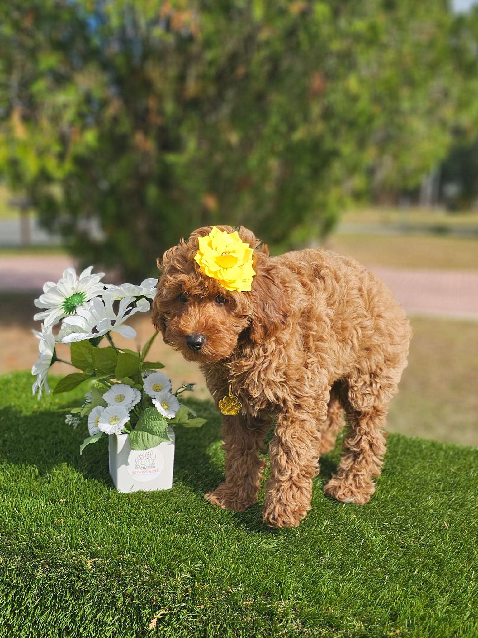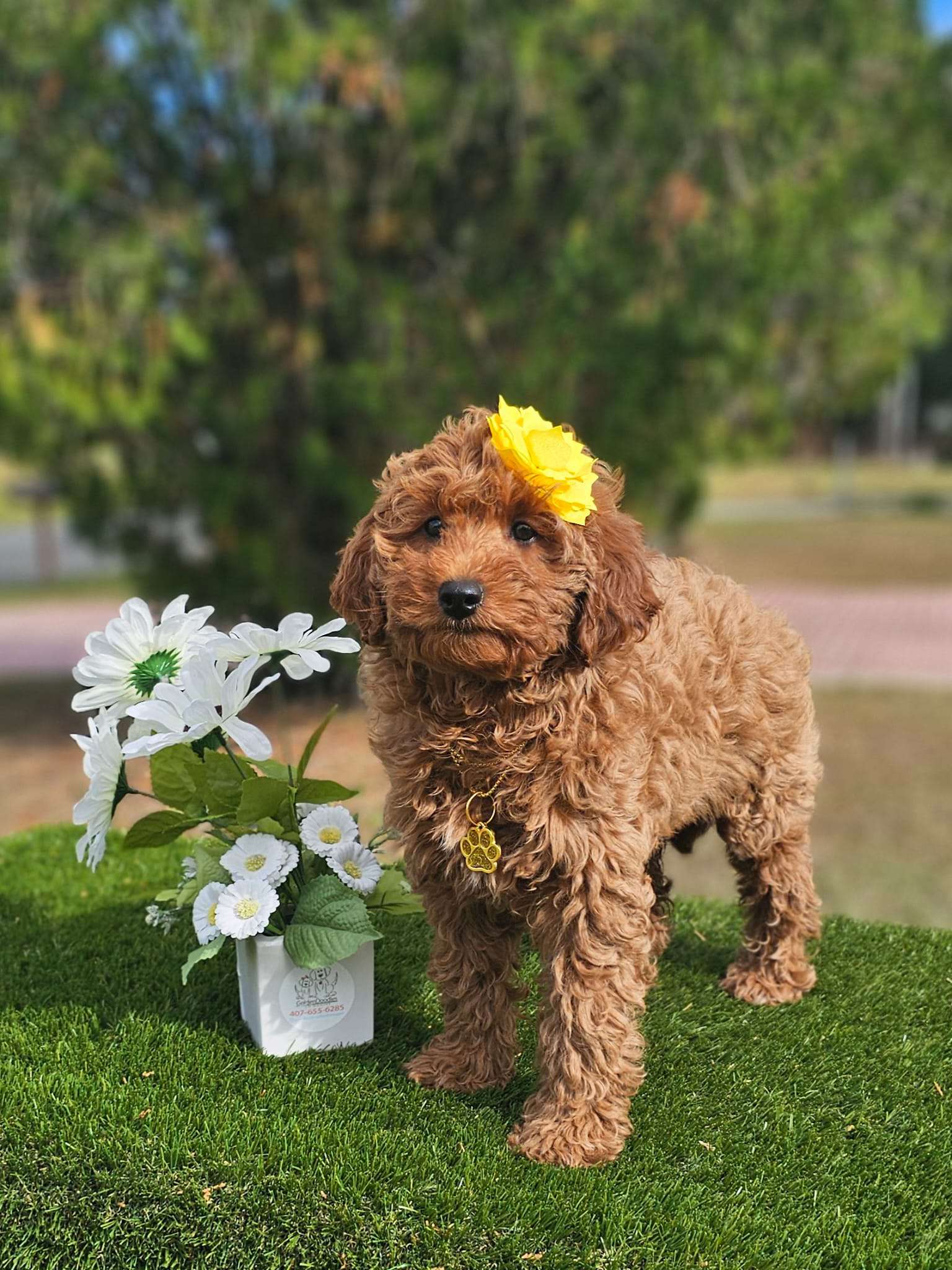 Meet Mini Cinnabar, a female mini Goldendoodle with a graceful and elegant personality! Mini Cinnabar carries herself with a certain poise, making her seem almost regal. She loves to be the center of attention and enjoys being pampered with grooming sessions and stylish accessories. Mini Cinnabar is very sociable and loves to mingle at gatherings, always making a lasting impression with her charm. Despite her elegant demeanor, she has a playful side that comes out during her favorite activities, like chasing bubbles or playing with her favorite squeaky toy. Her blend of grace and playfulness makes Mini Cinnabar a truly unique and delightful companion. For more information please visit us at https://goldendoodlesbyaggie.com/available-pups/ or call/text us at (407)655-6285.